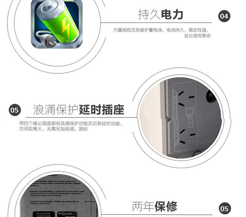 電池保護(hù)和電涌插座:為需要UPS備用電池的連接設(shè)備儲(chǔ)備電源容量和運(yùn)行時(shí)間,同時(shí)為太重要的設(shè)備僅提供浪涌保護(hù)。