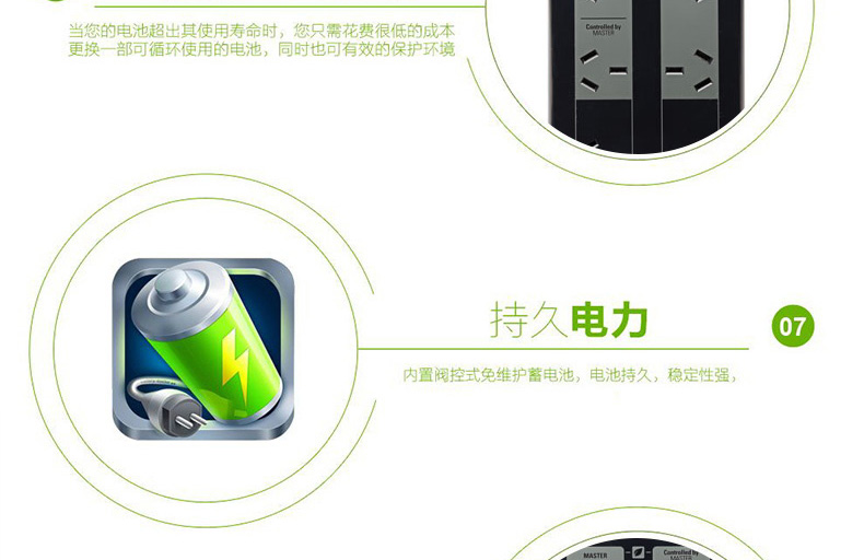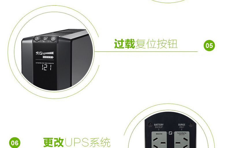 電池保護(hù)和電涌插座:為需要UPS備用電池的連接設(shè)備儲(chǔ)備電源容量和運(yùn)行時(shí)間,同時(shí)為太重要的設(shè)備僅提供浪涌保護(hù)。