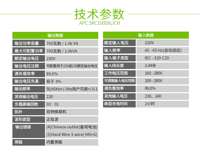 施耐德APC SRC1000XLICH 在線式UPS不間斷電源/700W/1000VA 標(biāo)機(jī)帶電池