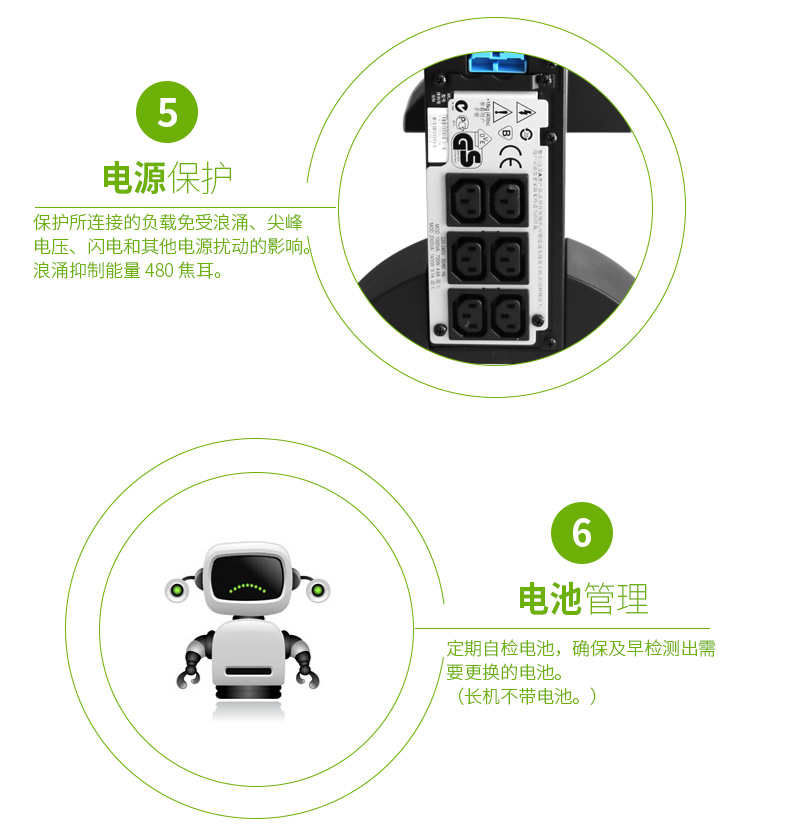 低運(yùn)行維護(hù)成本和可靠的智能電池管理:由APC公司首創(chuàng)的智能電池管理可通過智能化、精確的溫度補(bǔ)償充電來最大限度地提高電池的性能并延長其壽命。自動(dòng)自檢確保了電池的可靠性并可在更換電池前向用戶發(fā)出警告。方便、易于連接、可熱插拔的電池模塊使得無需斷電就能進(jìn)行電池更換。