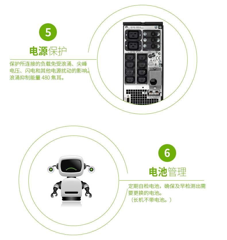低運(yùn)行維護(hù)成本和可靠的智能電池管理:由APC公司首創(chuàng)的智能電池管理可通過智能化、精確的溫度補(bǔ)償充電來最大限度地提高電池的性能并延長其壽命。自動(dòng)自檢確保了電池的可靠性并可在更換電池前向用戶發(fā)出警告。方便、易于連接、可熱插拔的電池模塊使得無需斷電就能進(jìn)行電池更換。