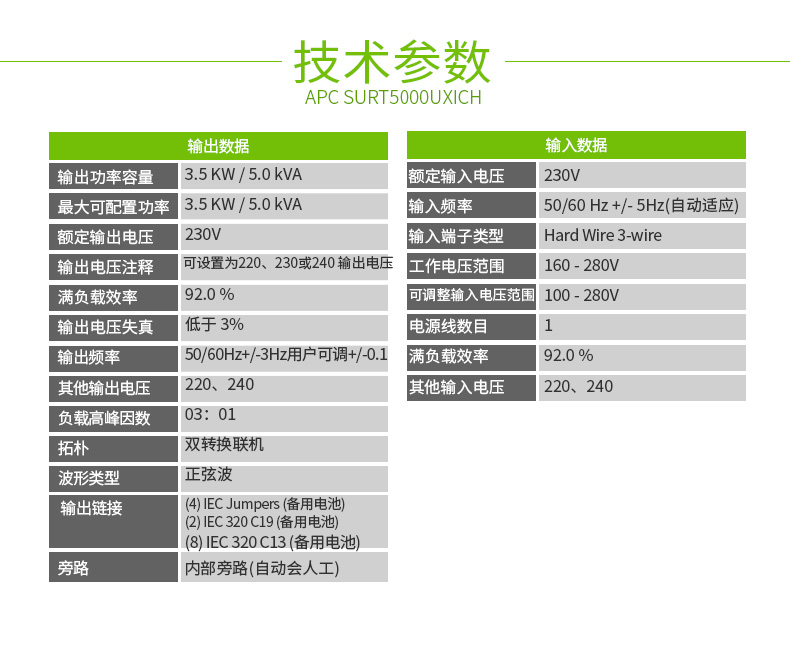 施耐德APC SURT5000UXICH 在線式UPS不間斷電源/3500W/5000VA 長機(jī)不帶電池