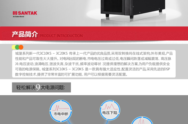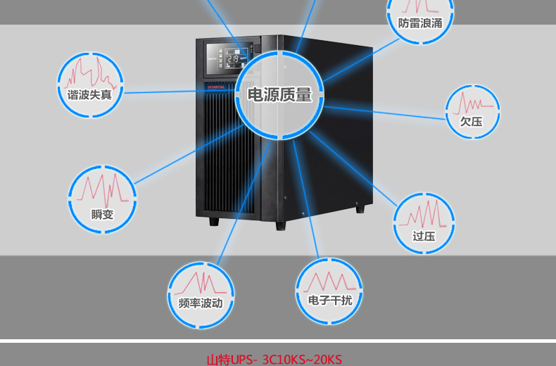 山特3C10KS系列UPS---傳承上一代產(chǎn)品的優(yōu)良品質(zhì),采用雙轉(zhuǎn)換純?cè)诰€式架構(gòu),外形美觀,產(chǎn)品性能和產(chǎn)品可靠性大大提升。 對(duì)電網(wǎng)出現(xiàn)的斷電、市電電壓過高或過低、電壓瞬間跌落或減幅震蕩、 高壓脈沖、電壓波動(dòng)、浪涌電壓、諧波失真、雜波干擾、頻率波動(dòng)等狀 況提供理想的解決方案,為用戶負(fù)載提供安全可靠的電源保障。山特3C10KS是一款具有強(qiáng)大適應(yīng)性、配置靈活的產(chǎn)品,采用先進(jìn)的DSP數(shù)字控制技術(shù),提供了非常豐富的可擴(kuò)展功能, 用戶可以根據(jù)需要靈活配置。