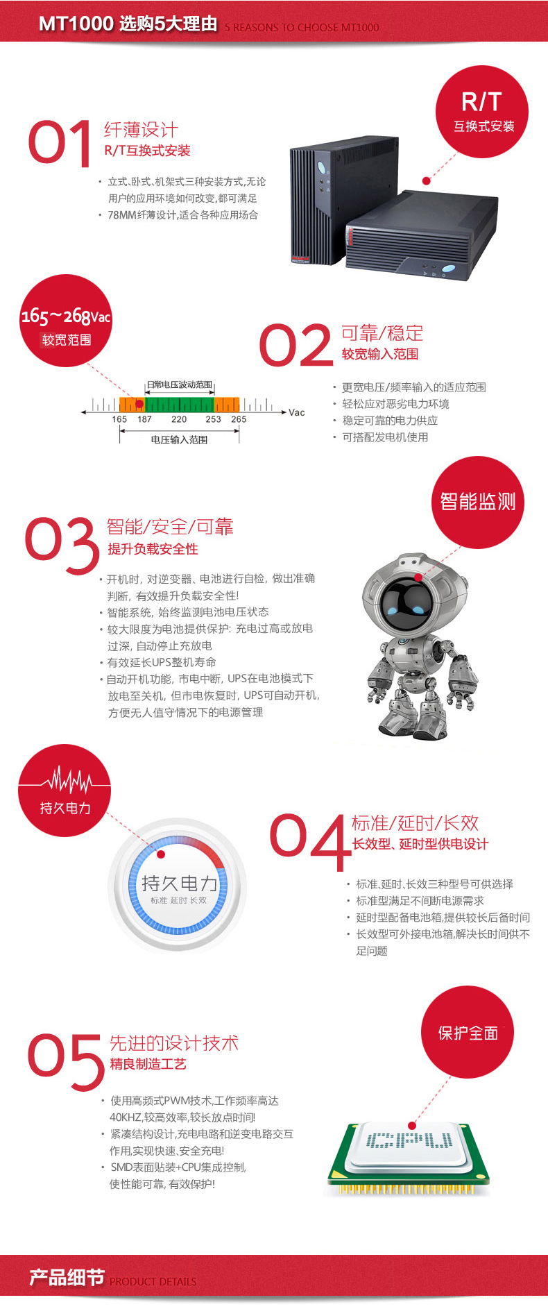 MT- pro系列是智能上網(wǎng)型UPS,可提供各種通訊連接方式的電源管理方案。采用先進(jìn)的CPU集成控制技術(shù),并擁有超寬電壓輸入范圍和獨(dú)特的立式、臥式、機(jī)架 式三種安裝方式;還特別配置穩(wěn)壓輸出電源插座、浪涌保護(hù)插座和智能插卡,是中小企業(yè)、政府及教育等行業(yè)的服務(wù)器、網(wǎng)絡(luò)設(shè)備及工控產(chǎn)品的理想保護(hù)電源。