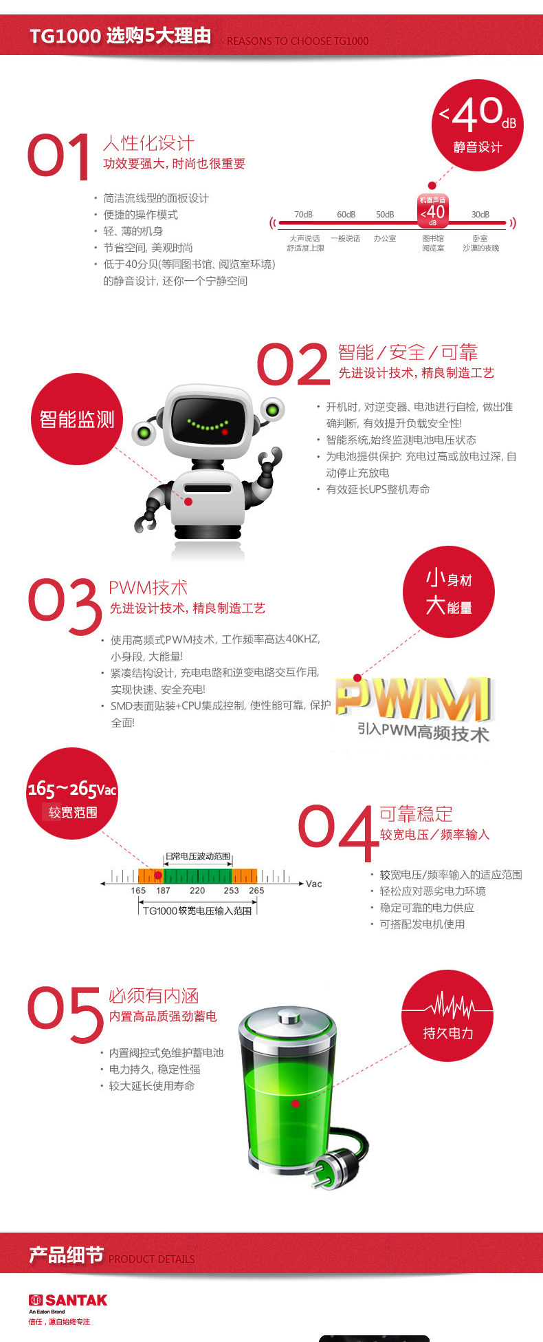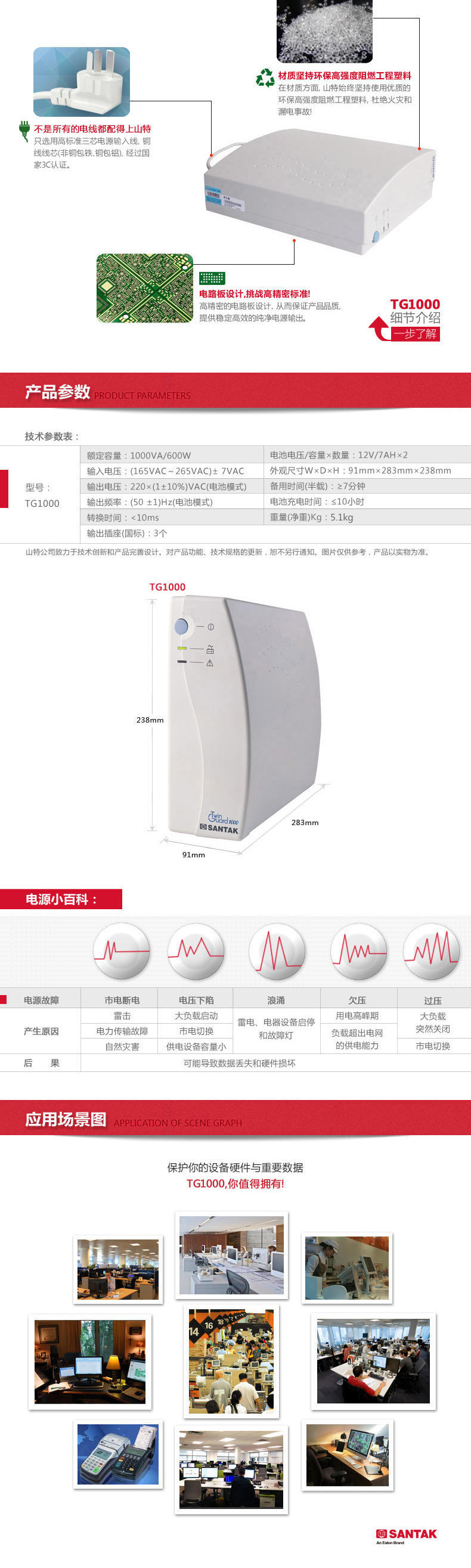 山特TG1000 TwinGuard(TG)系列UPS適用于PC機(jī)及其外圍設(shè)備(打印機(jī)、掃描儀、路由器 、Modem ),穩(wěn)定性高,可靠性強(qiáng)。輕松走入家庭和辦公環(huán)境 ,幫您節(jié)省有效空間。對(duì)于PC用戶而言,計(jì)算機(jī)周圍擁擠不堪的狀況變得輕松、和諧。面板簡(jiǎn)潔明快、容易操作。