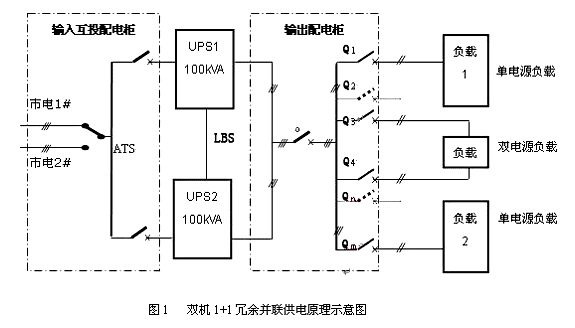 為了容易分析,在這里只用兩臺UPS作1+1冗余并機,如圖1所示。后面的所有負載之和小于100kVA,兩臺UPS的輸出電壓在輸出配電柜內(nèi)直接并機,然后再通過開關給負載供電。如果遇到雙電源負載就可以分別從輸出配電柜上各引一路到負載,同時滿足雙電源輸入的條件。