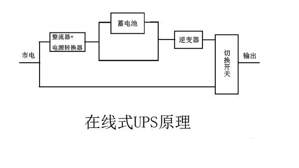 我們?cè)賮?lái)看下在線式UPS的工作原理。